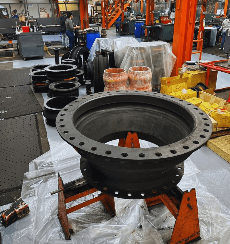 Another interesting collection of flex connectors is being prepared for shipment. The connector in the foreground is a 42” x 30” neoprene reducer to be installed on the sea water inlet